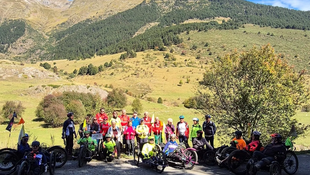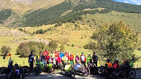 Y de repente, al girar en el camino de regreso se produjo algo inesperado. Sí, fue un encuentro casual con amigos de Barbastro que junto a compañeros catalanes formaban parte de un pelotón de bicicletas adaptadas. En ese feliz instante… ¡Qué menos que hacer una foto entre amigos catalanes y aragoneses unidos para vencer la discapacidad…!