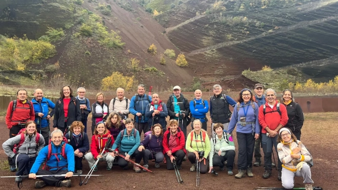 Veintisiete montañeros y montañeras partíamos ese día, bajo un cielo nublado, desde Can Serra, hacia el Este, camino del Volcán del Croscat. Su ladera, tallada por una cantera, y recuperada con mimo posteriormente nos permite observar la gama de ocres de los estratos formados en mil erupciones. Girando hacia el sur, y caminando entre carrascales, robledales, masías y verdes campos de labor de tierra nos dirigimos al volcán. Ascendemos una de sus caras y nos adentramos en su cráter. En él, el bosque que cubre sus laderas da paso a una llanura de tierra negra, en cuyo centro se sitúa la ermita que le da nombre. De origen románico, destruida en el terremoto de Olot de 1427, y reconstruida a principios del siglo XX, su objetivo, dicen, era clausurar con ese lugar sagrado la puerta del infierno, para que no se abriese en otra erupción. Seguiremos nuestra circular hacia la iglesia -también de origen románico, aunque muy transformada, de Sant Miquel Sacot. La preciosa Fageda (hayedo) d'en Jordà, que se extiende muchas hectáreas sobre un terreno ondulado, pero casi llano será un gran broche final para esta ruta, diversa, variada y preciosa. Además, pese a lo previsto, no ha llovido. Hemos recorrido 14 km y subido unos 500 m de desnivel.