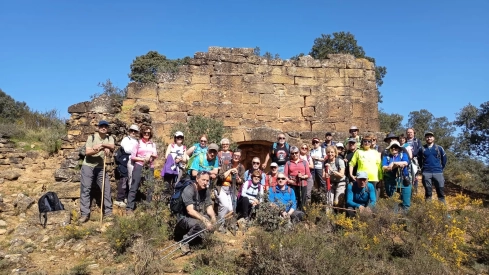 Superada la pequeña ascensión alcanzamos el camino que viene de Arbaniés y giramos a la derecha tomando la dirección hacia Liesa, entre campos de cultivo y algo de bosque hasta llegar a una zona bien interesante conocida como los Frontones; En este espacio, situado en alto y con amplio suelo de piedra llana, es fácil imaginar que estuviera poblado en tiempos remotos ya que aún conserva tumbas excavadas en la roca, así como restos muy deteriorados de un molino de aceite en piedra circular (Trapetum romano), junto con piezas de un contrapeso de piedra ranurado para la prensa del aceite, vale la pena acercarse hasta allí para verlo (ahora que aun está).