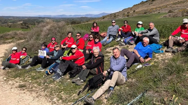 Sin embargo, l@s de Marcha Nórdica, privilegiamos de forma unánime salir a caminar desde Castillazuelo para disfrutar oliendo a tomillo, romero y espliego; siendo hipnotizad@s por el amarillo chillón de las aliagas en flor y sintiendo esa relajación tan placentera del verde esperanza tiñendo los sementeros que flanquean el camino. La comunión con las plantas es tan grande que incluso nuestra guía Esther, buena conocedora del terreno, explica sus riquezas y propiedades e incluso invita a llevarnos a la boca flores u hojas inofensivas.