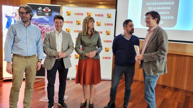 El impacto de la Quebrantahuesos entre los ingresos directos, indirectos e inducidos asciende a 17,7 millones de euros a los que hay que sumar los propiciados por el efecto de la notoriedad que trasciende el territorio (esto es, la promoción) y también por las consecuencias sociales favorables. Es la conclusión del estudio presentado en la Diputación Provincial de Huesca por Jorge Gómez, director gerente de Fundesa (de la Cámara de Comercio), con Berta Fernández (alcaldesa de Sabiñánigo), Fernando Blasco (director de Tuhuesca), Aitor Jiménez (responsable de Octagon) y Enrique Ascaso (de la Peña Cicloturista Edelweiss), en un acto en el que Blasco ha anunciado una inversión de 100.000 euros este año para la prueba ciclista sabiñaniguense.
