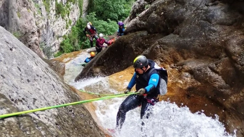 Con la roca resbaladiza, varios destrepes, toboganes, vamos realizando los diferentes rápeles, a cual más bonito, alguno más arrampado que otro, hasta que llegamos al penúltimo, de unos cuarenta metros, desde el cual pudimos disfrutar de unas vistas realmente impresionantes del valle que se abría ante nosotros. Al principio aparecen algunos nervios, para después, poco a poco ,disfrutar del descenso. Inmediatamente se accede al último rápel que es el más estético, bonito, encajonado, casi salvaje, de todo el barranco y que nos lleva al final del recorrido. Un sendero que sigue por el río nos lleva directamente a la carretera, a pocos metros de donde hemos dejado los coches.