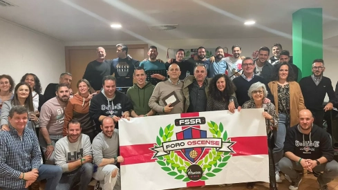 La fiesta anual de la peña azulgrana Foro Oscense en la Peña La Parrilla acogió un emotivo homenaje a Raúl Ferrer, encargado de material de la SD Huesca, en reconocimiento a sus años de trabajo y dedicación al club.