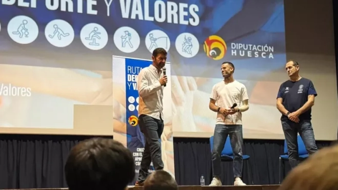 La Ruta Deporte y Valores de la DPH ha llegado este miércoles hasta Sariñena. El periodista Álex Castresana ha coordinado una charla con Dani Jiménez, portero de la SD Huesca, y José Nolasco, entrenador de Bada Huesca. El encuentro se ha desarrollado en el Cine El Molino y han participado los alumnos y alumnas del IES Gaspar Lax. Tanto Jiménez como Nolasco han lanzado un mensaje certero que ha calado entre los estudiantes monegrinos.