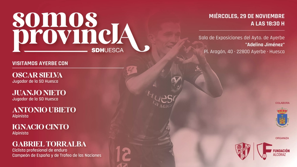 Después del último encuentro en Sabiñánigo el pasado mes de octubre, llega una nueva parada de 'Somos Provincia', un encuentro con deportistas impulsado por la SD Huesca y la Fundación Alcoraz. Esta vez la ubicación estará en Ayerbe, en la sala de exposiciones del Ayuntamiento el próximo miércoles día 19 de noviembre a las 18:30 horas.
