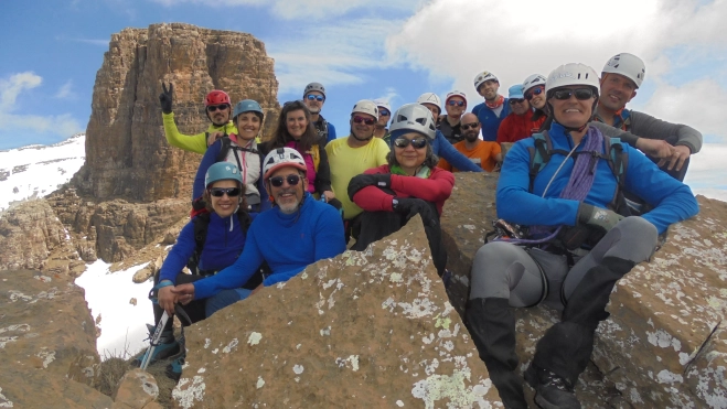 Poco después recogemos cuerdas y todo el material y nos disponemos a bajar por donde hemos subido volviendo a pasar por los inclinados neveros y felices del reto conseguido.