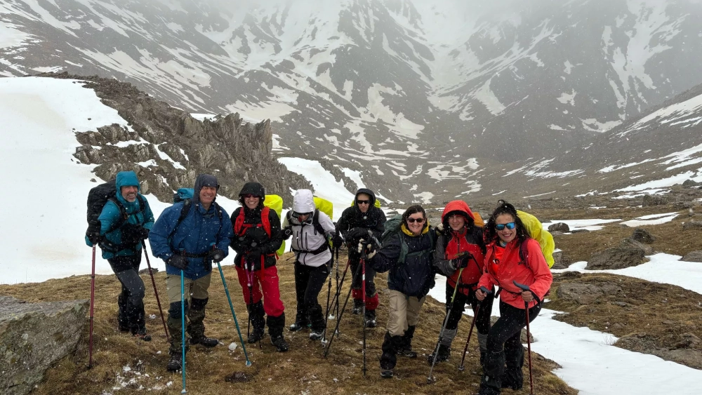 Poco después proseguimos de nuevo en marcha con la moral alta, pero con algunas dudas de poder llegar hasta la cima. Ahora, a unos 1.900 metros de altura, comienza a nevar y con bastante niebla que dificulta el rumbo a seguir.