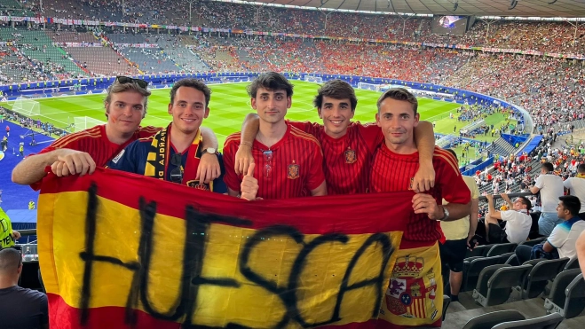 Con la voz destrozada, muertos de sueño y a punto de embarcar para poner rumbo a España, cinco amigos oscenses que estuvieron presentes en la gran final de la Eurocopa atienden a la llamada de EL DIARIO DE HUESCA. La bandera española con el nombre de "Huesca" estuvo presente en el Olímpico de Berlín. La alegría se desbordó con los goles de Nico y Oyarzábal, y Diego Tebas, Nico Pérez, Santos Santolaria, Rodrigo Redal y Antonio Gayán, seguidores acérrimos del Huesca, relatan su experiencia en un día que jamás olvidarán.