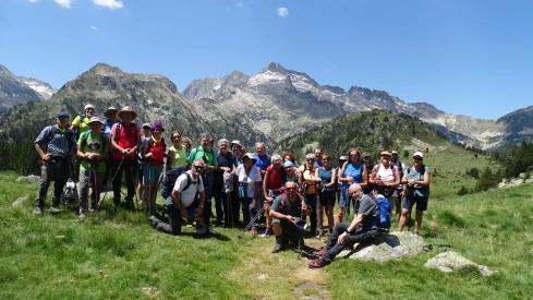 La jornada no iba a comenzar bien: la carretera de acceso al lago Cap de Long estaba cerrada. Había estado en obras, pero nos aseguraron que iba a quedar abierta al tráfico el día 22. Error de planificación. Esto trastocaba nuestros planes y había que cambiar de itinerario. El autobús tuvo que dirigirse al parking del lago Oredon. Y allí comenzamos nuestra ruta alternativa. En el mismo parking tomamos un sendero que se dirigía hacia el este y que ascendía por el bosque de Camou mediante fuerte pendiente. El sendero estaba escalonado por abundantes losas graníticas que hubo que ir superando con algo de esfuerzo, pero ayudados por los peldaños con frontales de madera que el Parque Nacional ha dispuesto a lo largo de todo el trayecto para evitar su erosión. De momento la temperatura era muy fresca y agradable. El bosque era increíblemente frondoso con abundancia de pinos, abetos, abedules y servales, junto con una exuberante vegetación de arándanos y sobre todo de floridos rododendros que afortunadamente nos acompañarían durante toda la jornada. Después de una parada para dar cuenta de un buen merecido almuerzo, continuamos el ascenso hasta alcanzar enseguida el collado de Estoudou, mirador estratégico desde donde se pueden contemplar los profundos valles y los altivos picos y crestas que nos rodean.