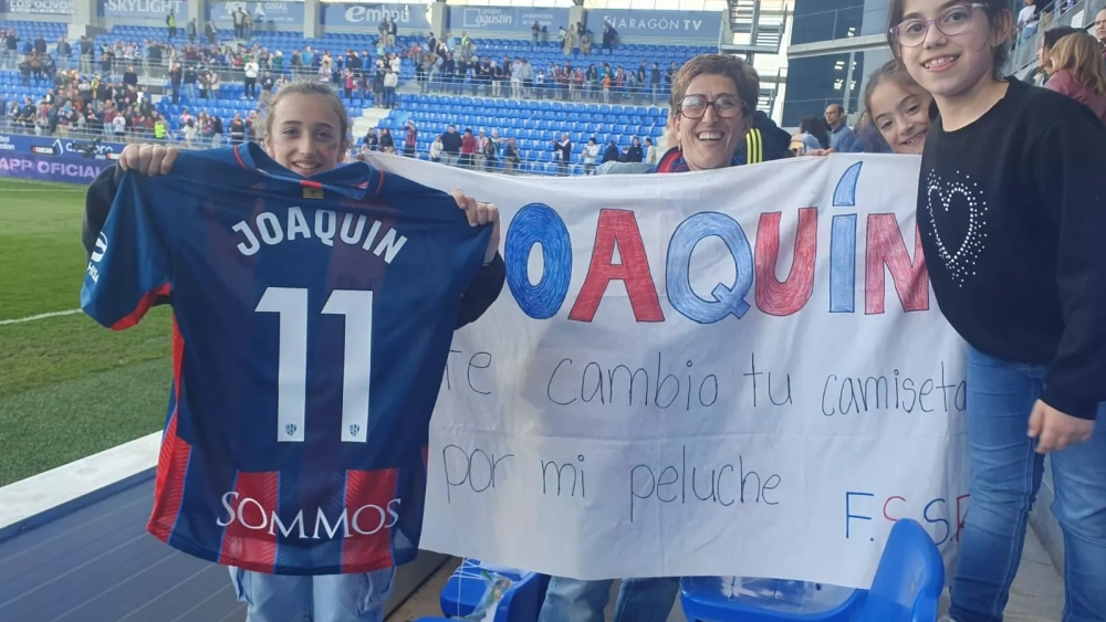 Un bonito momento de la campaña "¡Huesca, sí se puede!" quedó en expectativa. Vega, hija de Nuria Vicente, en la entrevista con Álvaro Fernández, le reconocía que todos los partidos acudía con una pancarta en la que ofrecía a Joaquín Muñoz un peluche a cambio de su camiseta.