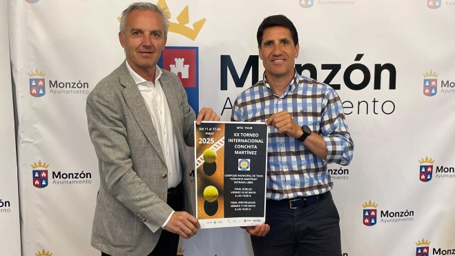 El concejal de Deportes, Eliseo Martín, y el director del Torneo, Michel Irigaray, han presentado, en el Salón Azul del Ayuntamiento de Monzón, el XX Torneo Internacional de Tenis Conchita Martínez, que se celebrará del 11 al 17 de mayo en el complejo Conchita Martínez con entrada libre, dotado de 15.000 euros.