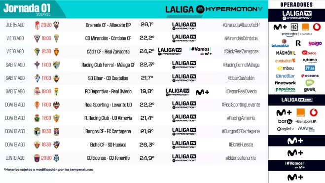 LaLiga ha dado a conocer los horarios de la primera jornada de Segunda División. El partido Elche-Huesca se disputará el domingo día 18 de agosto, a partir de las 19:30 horas, en el Martínez Valero. De acuerdo con el programa que ofrece LaLiga de la sesión inaugural, será el duelo que se jugará con la temperatura más elevada. La previsión es de 26,3º, levemente superior a los 26,1º que se anuncian para el Granada-Albacete, programado para el jueves día 15 a las 20:30 horas y que será el que abra el campeonato.9: