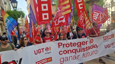 Bajo el lema “Protege lo conquistado, gana futuro”, se ha desarrollado este jueves en Huesca la manifestación del 1º de Mayo, Día Internacional del Trabajo convocada por las organizaciones sindicales CCOO y UGT, con la participación de la HOAC y de centenares de personas.