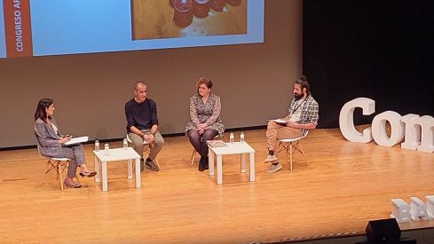 Paula Lacasa, de la Cámara de Comercio, ha dirigido la mesa “Los obradores artesanales, comercios básicos del medio rural. Mesa de experiencias de elaboradores agroalimentarios que realizan venta directa", que ha reunido a Víctor Chárlez (Panadería Jovita de Naval), Reyes Pueyo (Carnicería Isabel de Naval) y Sergio Ferrer (de Aceites Ferrer, de Bierge)