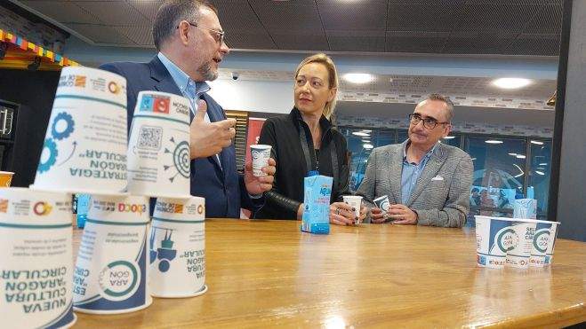 Una tirada de vasos desechables ilustrados con dibujos y textos sobre la Estrategia Circular de Aragón y el Sello Aragón Circular representa el banderazo de salida de la línea de la empresa de vending Eboca cuyos primeros frutos ya se perciben en la colaboración a tres bandas con Defeder Alcolea y Viñas del Vero, y que ha sido "bendecida" por la consejera de Economía, Planificación y Empleo del Gobierno de Aragón, Marta Gastón Menal, en las instalaciones en las que reciben las dos vacas gigantes. En el acto, han participado además el presidente anfitrión, Raúl Benito, y el director general de Planificación y Desarrollo, Miguel Luis Lapeña, junto a otros directivos de la compañía.