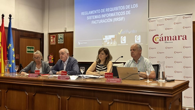 Más de 300 personas, tanto de forma presencial como online, han participado esta mañana en la jornada informativa sobre el Reglamento Verifactu, organizada por la Cámara de Comercio de Huesca en colaboración con la Agencia Tributaria. Este nuevo marco normativo se implantará como herramienta de lucha contra el fraude fiscal en los sistemas de facturación electrónica.