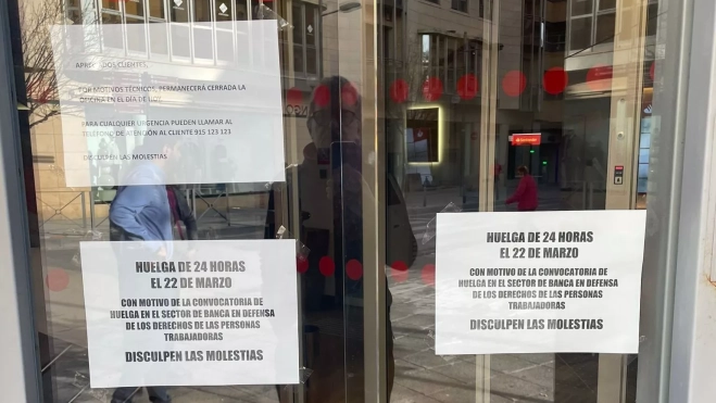 Los clientes de Banco Santander, BBVA y Banco de Sabadell han encontrado las oficinas de Huesca con el cartel de "Cerrado 22 de marzo con motivo de la convocatoria de huelga en el sector de banca, en defensa de los derechos de las personas trabajadoras. Disculpen las molestias", junto a otra leyenda con el teléfono de atención al cliente. El paro convocado por CCOO Servicios del Sector Financiero, UGT Financiero y FINE (Federación Fuerza, Independencia Empleo) ha sido secundada por todo el personal y a nivel regional y nacional (75,8 %) de manera importante, aseguran los sindicatos. Respecto al parcial de dos horas del 26 de febrero, la diferencia es que entonces también participaron empleados de las antiguas cajas de ahorro y las cooperativas de crédito (las rurales), que ya han alcanzado acuerdos con sus respectivas patronales.