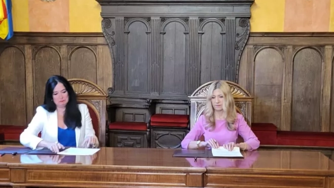 La vicepresidenta segunda del Gobierno de Aragón y presidenta de Sodiar (Sociedad para el Desarrollo Industrial de Aragón), Mar Vaquero, y la alcaldesa de Huesca, Lorena Orduna, han firmado en el Salón del Justicia del Palacio Consistorial un convenio para apoyar a microempresas y autónomos con un montante de 15.000 euros susceptible de ser aumentado en el caso de que se detectaran necesidades más amplias.