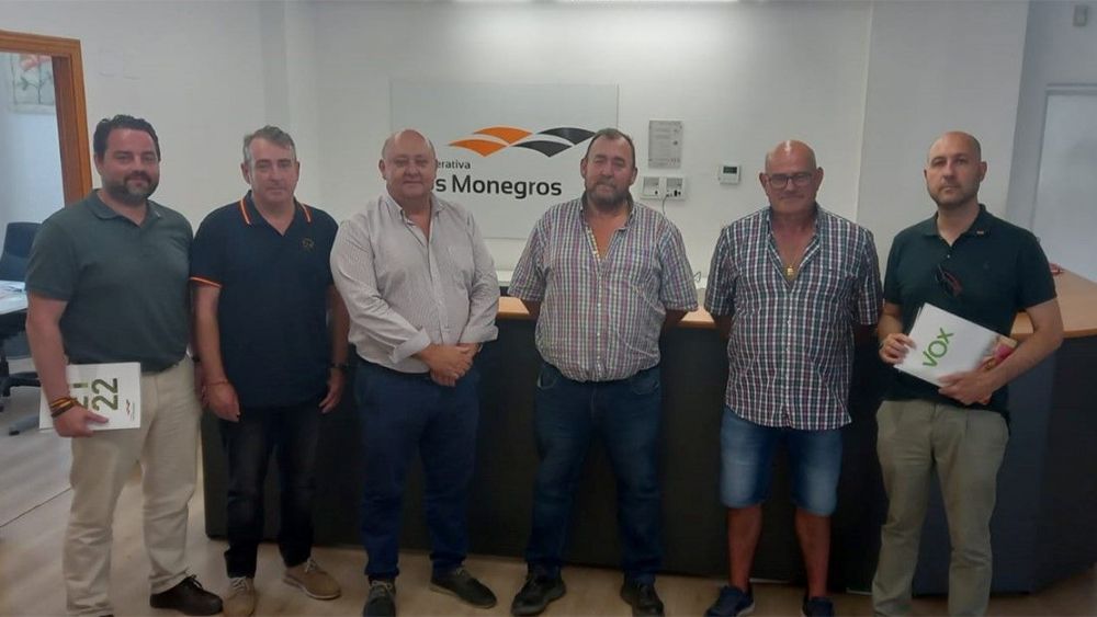 El candidato al Congreso por Huesca, Josema Vallejo, y el diputado autonómico por Huesca David Arranz se han reunido en la sede de Sariñena de la Cooperativa de Monegros con Víctor Nogués, presidente de Cooperativas Agroalimentarias de Aragón, y varios de los miembros del Consejo de la cooperativa.