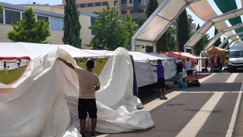 La avenida de los Monegros ha comenzado este viernes a transformarse para acoger, un año más, el tradicional mercado de venta ambulante que acompaña a las fiestas de San Lorenzo. Desde primera hora de la mañana, los vendedores han recogido sus autorizaciones y han iniciado el montaje de sus puestos, en una jornada marcada por la alta actividad propia de los preparativos.