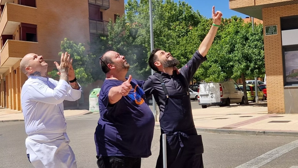 Guti, acompañado por Bernal y Valiente, ha encendido la mecha del cohete, que ha resonado al tiempo que la Charanga Chilindrón ha comenzado a tocar la música del baile de las espadas los danzantes, en un pequeño pero sabroso adelanto del arranque de las fiestas, en el que los asistentes han podido disfrutar de un vermú compuesto por varios pases salados y dulces creados por Bernal y Valiente.