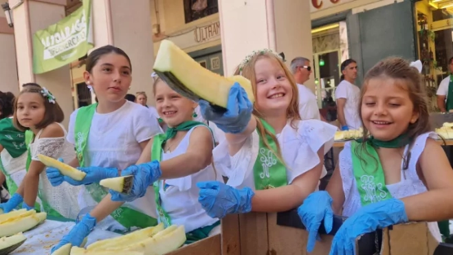 En una organización encomiable, se han preparado para repartir entre los oscenses cien kilos de jamón y 700 barras de pan para los bocadillos, también para celiacos, además de otros cien kilos de melón que se han cortado en el momento, y diversas bebidas para refrescarse en la calurosa mañana.