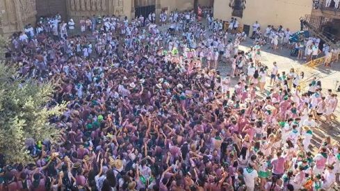 Una hora antes del inicio de las fiestas de San Lorenzo, la plaza del Ayuntamiento de Huesca rebosa de alegría.