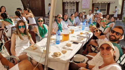 Similar composición, pero con matices, en los otros hoteles o en restaurantes arraigados. En algunos bares emblemáticos, como El Punto, Mariola hace la multiplicación de los panes y los huevos para optimizar el espacio. Ambientazo de par de mañana, como en Doña Sancha, donde 42 comensales zoitistas tienen cierta prisa porque no quieren perderse el Saludo al Santo con la imposición de la pañoleta por compañero de peña Quique Susín.