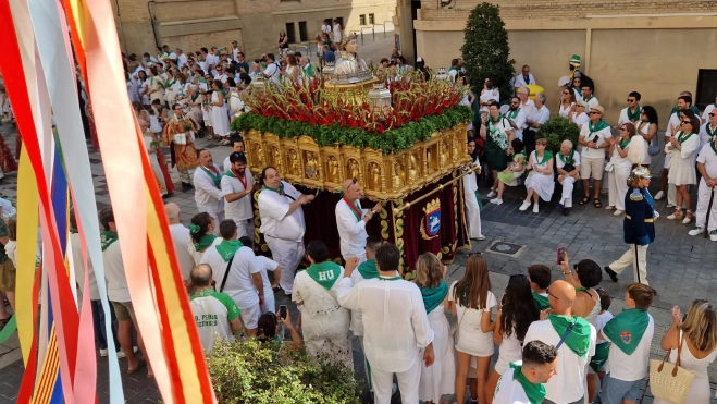 El itinerario ha llevado la peana de plata del siglo XVI, con doce escenas de la vida y muerte del mártir, desde la Basílica de San Lorenzo hasta la Catedral y de regreso por los Cosos. Han participado la alcaldesa Lorena Orduna, la concejala de Fiestas, Nuria Mur, ediles de PP, PSOE, VOX y el concejal no adscrito; el presidente de la Diputación de Huesca, Isaac Claver; la consejera de Servicios Sociales del Gobierno de Aragón, Carmen Susín; la diputada Ana Alós; la senadora Melania Mur; la presidenta de la Comarca de la Hoya, Mónica Soler; los alcaldes de Barbastro, Fernando Torres; de Grañén y diputado de Cultura, Carlos Sampériz; y de Graus, José Antonio Lagüéns; así como altos mandos del Ejército y la Guardia Civil. Junto al santo, el obispo Pedro Aguado y el prior de la Real Cofradía de San Lorenzo, Joaquín Almerge.