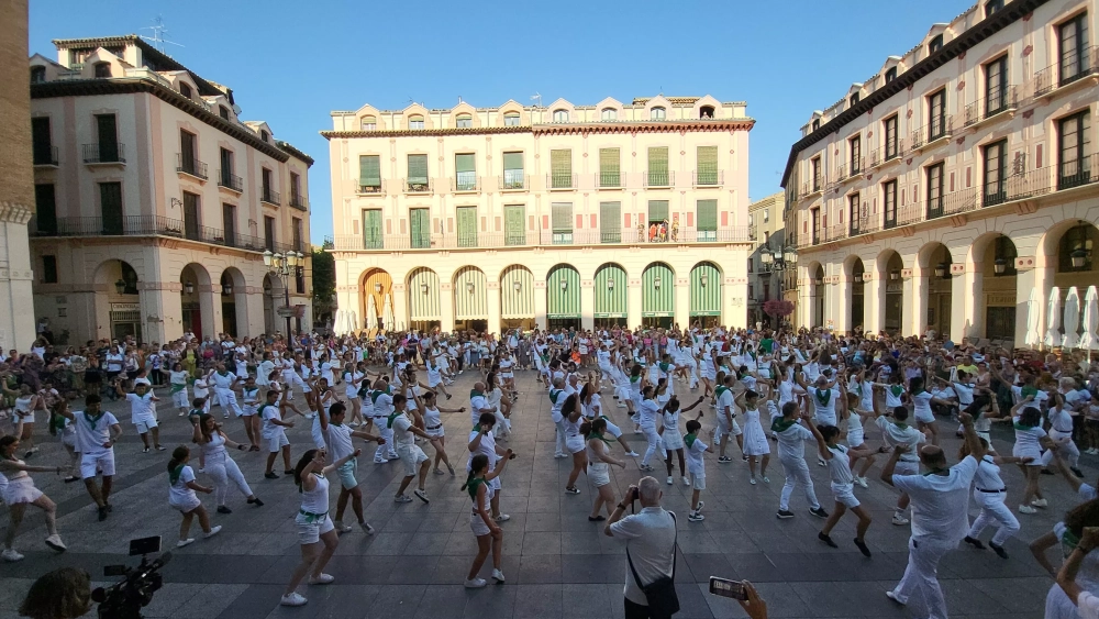 Decenas de oscenses han participado este jueves en un baile conjunto de la Jota de San Lorenzo, que ha llenado la plaza López Allué, en el arranque del Pórtico Laurentino en Huesca, que ya descuenta los días para sus fiestas.