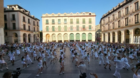 Entre los participantes, avezados joteros y principiantes, que han tenido ocasión de ensayar previamente este baile de la mano del maestro Jairo Périz, presente también en el acto. Todos vestidos de blanco y verde, los participantes han interpretado la jota por dos veces en la plaza López Allué, rodeados de público.
