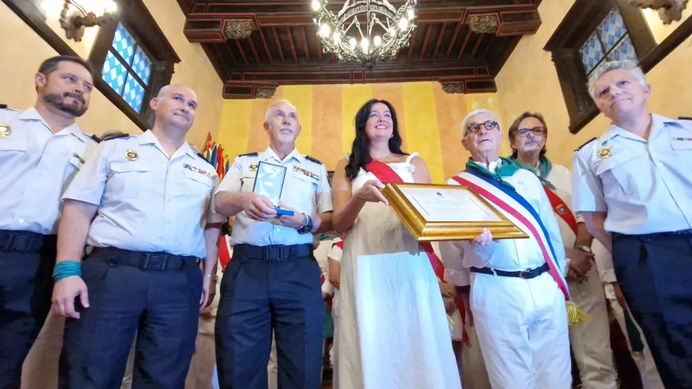 El acto previo al cohete de San Lorenzo ha tenido un significado especial, más allá del tradicional hermanamiento entre Huesca y Tarbes, con la entrega de la Medalla de Oro de Huesca a la Policía Nacional con motivo de su Bicentenario, que han recogido agentes encabezados por su comisario, Luis Fernando Ascaso.