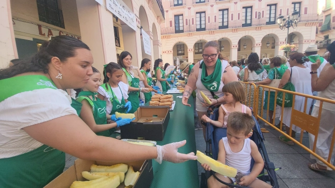 La Fiesta del Comercio de Huesca ha vuelto a demostrar este lunes su poder de convocatoria con el tradicional reparto de melón y bocadillos de jamón, acompañado de bebidas para todos los públicos. La cita laurentina, organizada por la Asociación de Comerciantes de la ciudad con la colaboración del Ayuntamiento, se celebra ininterrumpidamente desde hace 32 años y ha vuelto a llenar de ambiente la plaza López Allué en las fiestas de San Lorenzo.