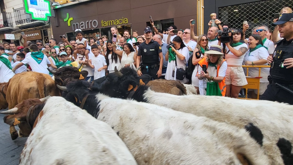 En la intersección entre el Coso Bajo y la calle Lanuza, el camión de la ganadería El Ruiseñor, de Frescano (Zaragoza), se ha abierto para dar paso a los seis minibueyes, que han sido recibidos con gritos de emoción. Decenas de niños, niñas y jóvenes han iniciado la carrera hasta la plaza de toros, seguidos por la atenta mirada de centenares de personas apostadas tras las vallas.