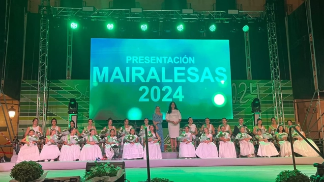 Las nuevas mairalesas y mainates han sido recibidos con sonoros vítores por sus antecesoras, que también han tenido protagonismo en el acto en el que han traspasado a testigo a las nuevas y nuevo representantes de los barrios y peñas.