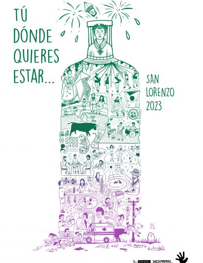El cartel de la campaña, que ha sido dibujado y diseñado por Paloma Munuera Mínguez, refleja, a través de una botella llena de ilustraciones, escenas cotidianas de las fiestas laurentinas en color verde en la parte superior. Al ir descendiendo la parte más baja del recipiente se tiñe de color vino y pueden verse situaciones habituales cuando se realiza un consumo excesivo de alcohol o drogas.