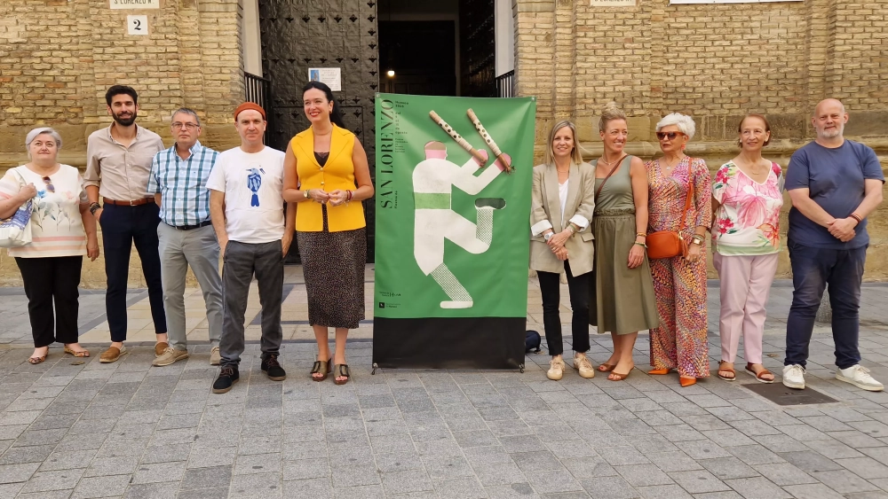 En la presentación también ha intervenido la alcaldesa de Huesca, Lorena Orduna, y la concejala de Fiestas, Nuria Mur. El acto se ha escenificado ante la basílica de San Lorenzo y que también ha contado con representantes de distintos colectivos implicados en el programa laurentino como la banda de música, los barrios, mairalesas y la Asociación Cuna de San Lorenzo, entre otros. La regidora ha considerado que no habían podido elegir mejor emplazamiento para dar a conocer la imagen creada por el artista, dado que es el 1800 aniversario de nacimiento del patrón.