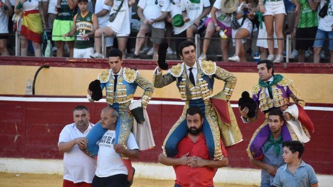 La puerta grande de la Plaza de Toros de Huesca se ha abierto de par en par este domingo. Perera, Talavante y De Justo han salido a hombros tras una provechosa tarde, con animales que han permitido proyectar la emoción hacia los tendidos, y que ha empezado concediendo trofeos por decreto y que ha terminado por méritos propios de unos toreros que no se han guardado absolutamente nada. Talavante y Emilio de Justo han firmado dos faenones de aúpa, rotundos a más no poder y sin ningún tipo de pero que les ha concedido la llave del portón. No así Perera, que ha cortado dos orejas excesivas de su primer toro. Una tarde mucho más torista que la del sábado que ha emocionado a Huesca.