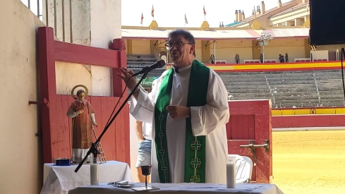 Josan Montull, cura salesiano, ha pronunciado la primera Santa Misa que celebra y reza por la próxima Feria Taurina de la Albahaca, en el patio de cuadrillas de la Plaza de Toros de Huesca rebosante de personas cristianas y taurinas, sin complejos, encabezadas por varias autoridades (Ricardo Oliván, Gemma Allué y Sonia Latre, concejales, Celsa Rufas, diputada provincial) y personalidades como el presidente de la Liga de Fútbol Profesional, Javier Tebas, y el presidente del Huesca Agustín Lasaosa. Como anfitrión, el presidente de Tauroemoción, Alberto García, que ha recibido con una sonrisa el deseo del celebrante de que esta feria sirva para "tauroemocionar a todos".