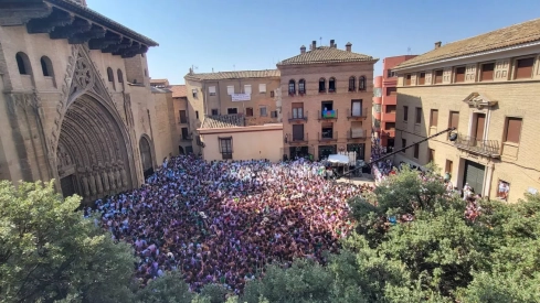 La Plaza de la Catedral, más de una hora antes del lanzamiento del cohete anunciador para el inicio de las fiestas de San Lorenzo de 2025, está llenándose de jóvenes que prácticamente tienen copada ya el centro del universo oscense.