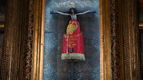 La oración acompañó esta tarde de miércoles al cambio del manto del Santo Cristo de los Milagros, que luce ya un precioso color rojo que simboliza la sangre del Señor que todos los cristianos tienen en su iconografía, en este caso acompañada por la del martirio de San Lorenzo expresada en la parrilla que luce sobre el tejido.