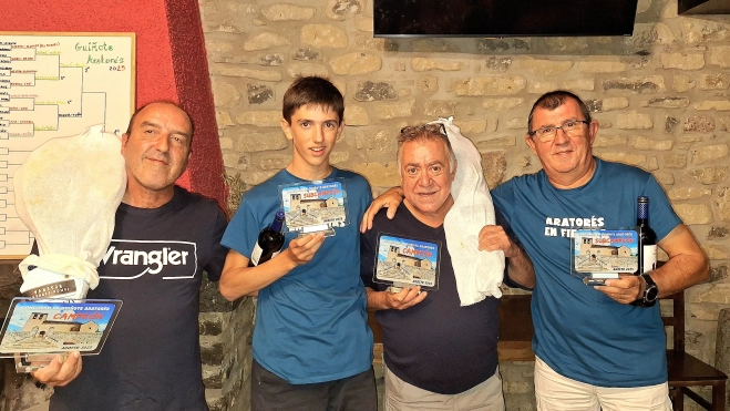 Por la tarde se celebró el tradicional concurso de guiñote en el local social, con buena participación de parejas y presencia destacada de jóvenes. La final se resolvió con la victoria de Miguel Ángel Azón y Juan Antonio Pérez, de Jaca, mientras que el segundo puesto fue para Juan Carlos e Ignacio Cebrián, de Aratorés.