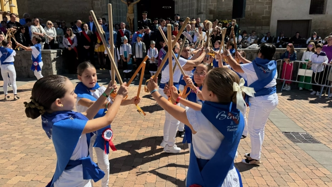 Después de la eucaristía, la cofradía ha sacado al Santo Cristo de los Milagros fuera del templo y en torno a él, la Asociación Folclore de Binéfar ha contribuido con el ritual festivo realizando el dance de cintas y posteriormente el de palos o ‘paloteau’, ante numeroso público que se congregaba en la plaza de la Iglesia.