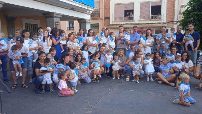 Los actos han continuado esta tarde con la colocación de la pañoleta a unos 80 niños y niñas nacidos entre el agosto de 2019 y el mismo mes de 2021, que disfrutan de sus primeras fiestas de San Antolín. El día 30, el acto será para los nacidos entre agosto de 2021 y 2022. El acto ha sido amenizado por la Rondalla Municipal.