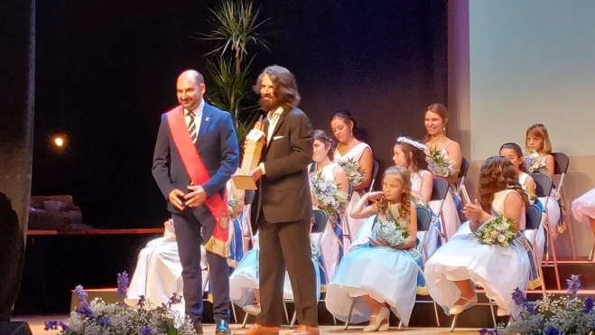 Edgar Abarca ha recibido un trofeo de manos de Fernando Torres, la reproducción de la torre de la Catedral de Barbastro, y juntos han escuchado a la edil de fiestas, Lorena Espiérrez, y al pregonero Felipe Salinas, antes de escuchar el Himno de Barbastro