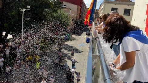 Al llegar al Ayuntamiento, portavoces las peñas han subido al balcón del Consistorio donde han lanzado sus respectivas proclamas festivas ante el delirio de los peñistas.