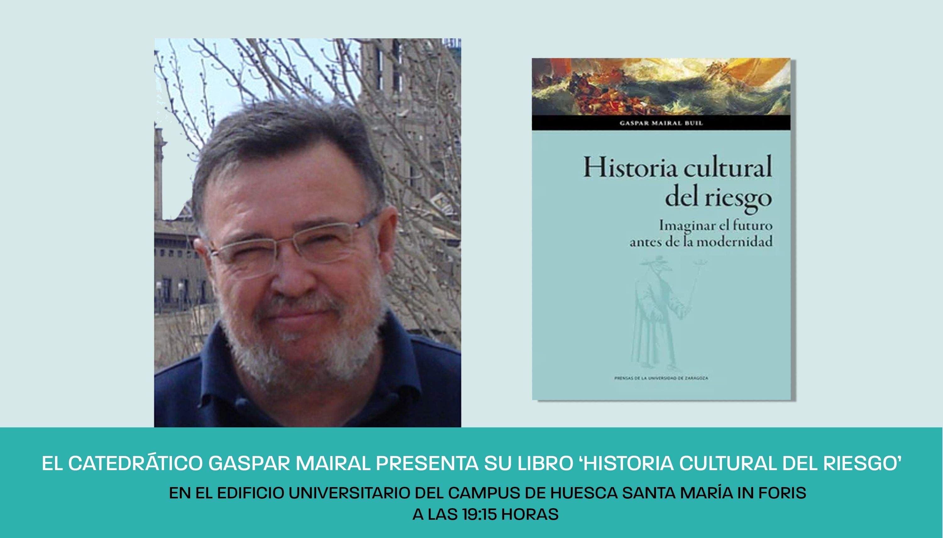 A las 19:15 horas en el edificio universitario de Santa María in Foris (ronda de Misericordia, 5, Huesca) Gaspar Mairal Buil catedrático de Antropología social en la Universidad de Zaragoza presenta su libro ‘Historia cultural del riesgo: Imaginar el futuro antes de la modernidad’. Esta actividad se engloba dentro de los Jueves universitarios que organiza el Campus de Huesca.