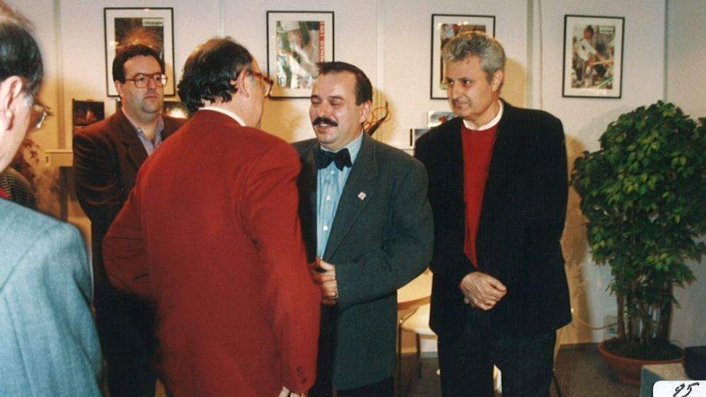 ¡Ay, la educación! Presumo por el perfil que a quien se ve menos es a Ignacio Martín-Retortillo, presidente de la Cámara. Era la inauguración de la tercera edición de la Feria de la Imagen y Sonido de Huesca. La espalda plena es la de Rafael Zorraquino, director general de Comercio y Consumo del Gobierno de Aragón. José Manuel Porquet saluda con sus dos líneas paralelas, la de sus emblemáticos bigote y pajarita. Y Antonio Angulo, prudencial, con su americana envolviendo su apego a los jerseys. Más atrás, un servidor, seguramente cubriendo la información. Cada uno en su sitio, en su puesto. En buena sintonía, pero sin intrusión en los espacios. Instintivamente, por el hábito, cada cual conocía su lugar.