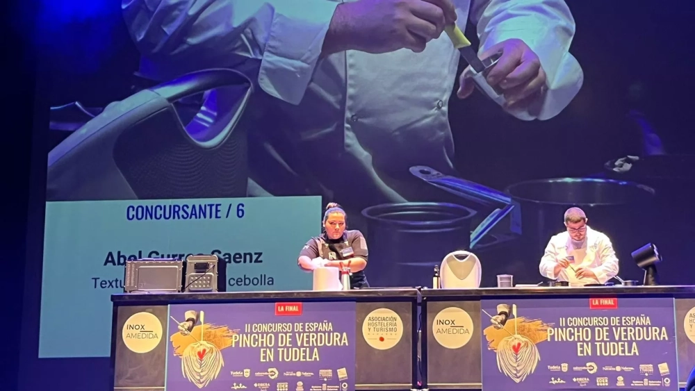Abel Gurrea Sáenz y Alba Blasco, jefe de cocina y jefa de repostería de La Venta del Sotón de Huesca, se han alzado con el Primer Premio del II Concurso de España de Pincho de Verdura celebrado en Tudela con su tapa Texturas de Coliflor y Cebolla que congrega la vocación del chef por las verduras y la habilidad de Alba en el manejo de las texturas.
