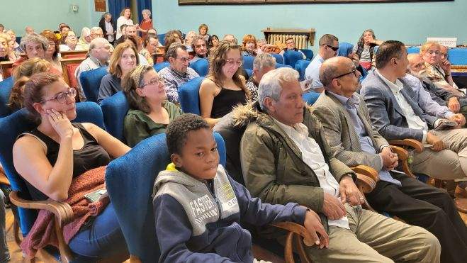 En otro momento de acto, Dadah siguió contando su historia, a ratos abrumado por la emoción. Vino a Huesca con el proyecto Vacaciones en Paz y se quedó acogido en casa de Mamen y José Luis, con un problema médico. Después, se prolongó la acogida, bajo la cobertura de Estudios en Paz. Hoy cursa el último año del Grado de Maestro de Infantil, como un miembro más de la familia Laliena-Aznar.